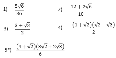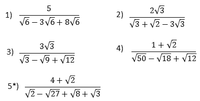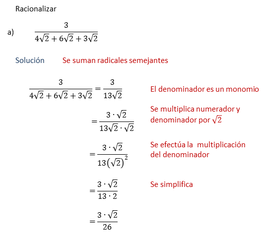 Si se simplifica cada radical, se consigue radicales semejantes. Al sumar los radicales semejantes el denominador queda escrito como un monomio con radical. Se procede entonces a racionalizar el denominador.