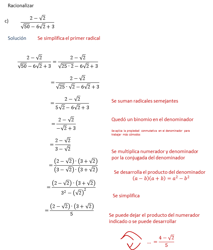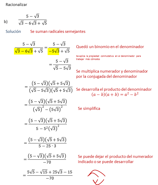 Al sumar los radicales semejantes se logra expresar el denominador como un binomio con dos radicales no semejantes. De allí se racionaliza siguiendo las recomendaciones del caso.