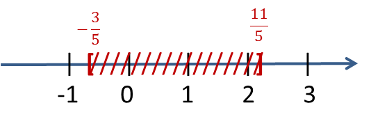 Paso 4 El conjunto solución es $\{x | - \frac{3}{5} \leq x \leq \frac{11}{5} \}$, es decir las $x$ en el intervalo $[ - \frac{3}{5} , \frac{11}{5} ]$. Su representación gráfica es