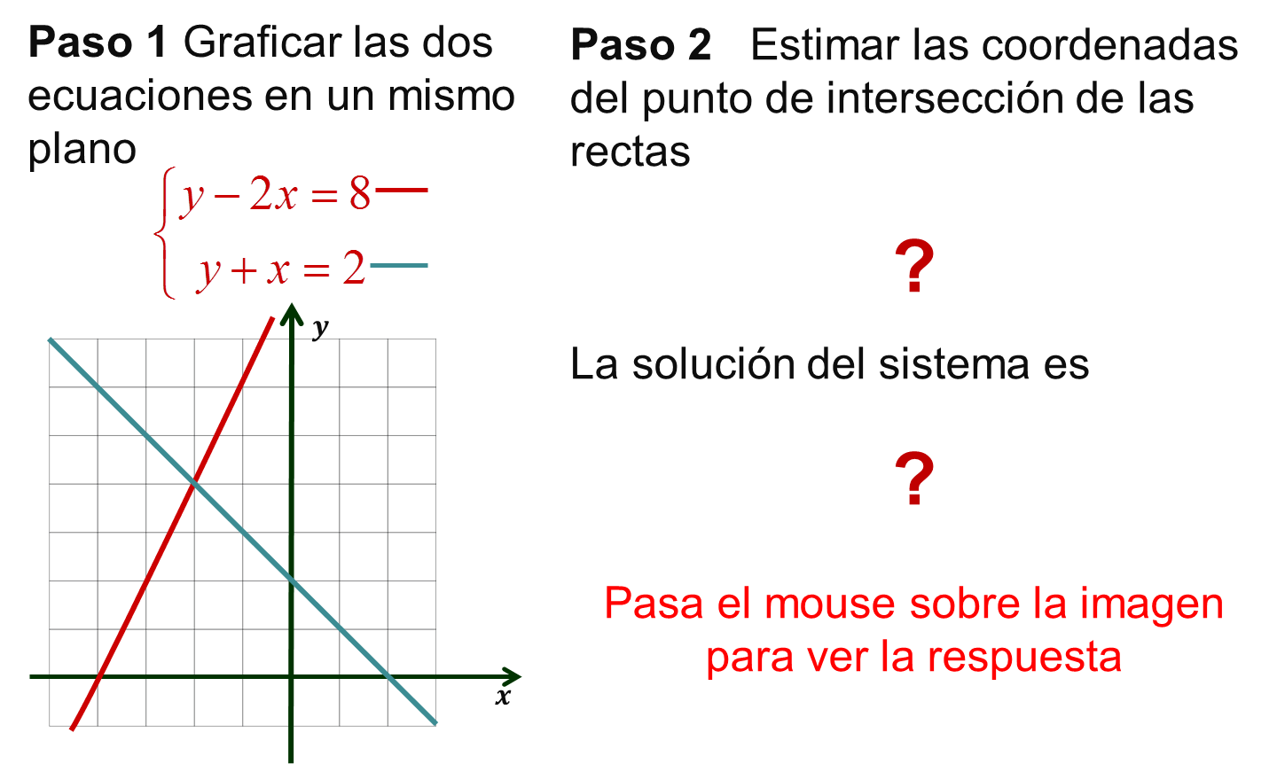 Ejercicios para después del video Resolver cada uno de los sistemas de ecuaciones dados por el método gráfico. a) $ \left \{ \begin{array}{rcl} y-2x= 8 \\ y+x= 2\ \end{array} \right . \quad $ b) $ \left \{ \begin{array}{rcl} y+2x=5 \\ y-x =2 \end{array} \right . \quad $