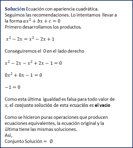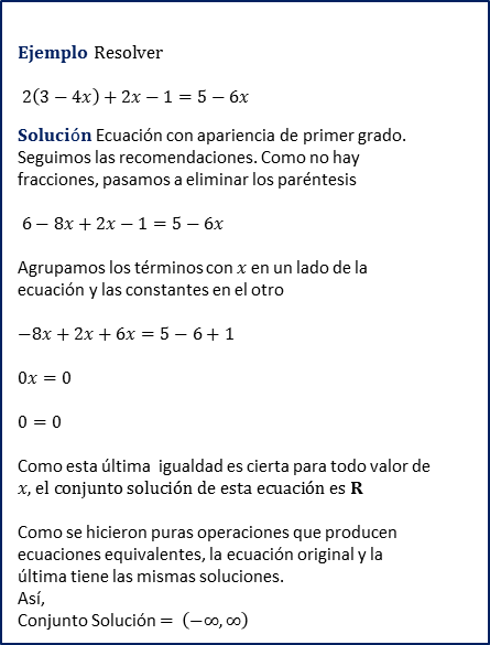 En este caso y en cualquier otro ejemplo que se llegue a una igualdad numérica cierta, luego de haber transformado la ecuación en otras equivalentes, concluiremos que el conjunto solución de la ecuación original será el mismo, R.