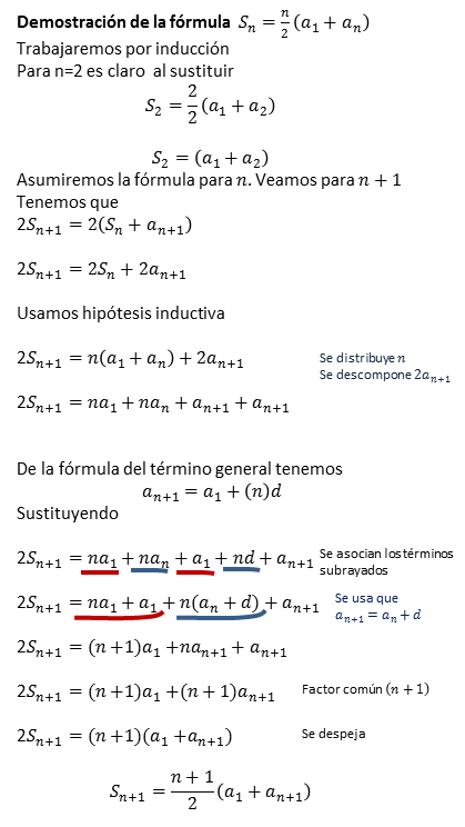 puede ser calculada rápidamente usando la fórmula que depende sólo del primer y último término. Mostramos dos pruebas.