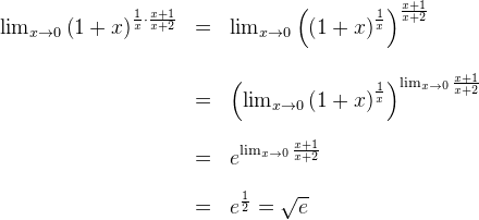 $ \lim_{x\rightarrow 0}\left ( \frac{x+1}{x+2} \right )^{x+2} $ $\; = \left (\lim_{x\rightarrow 0} \frac{x+1}{x+2} \right )^{\lim_{x\rightarrow 0}(x+2)} $ $\;=\left ( \frac{1}{2} \right )^2 $